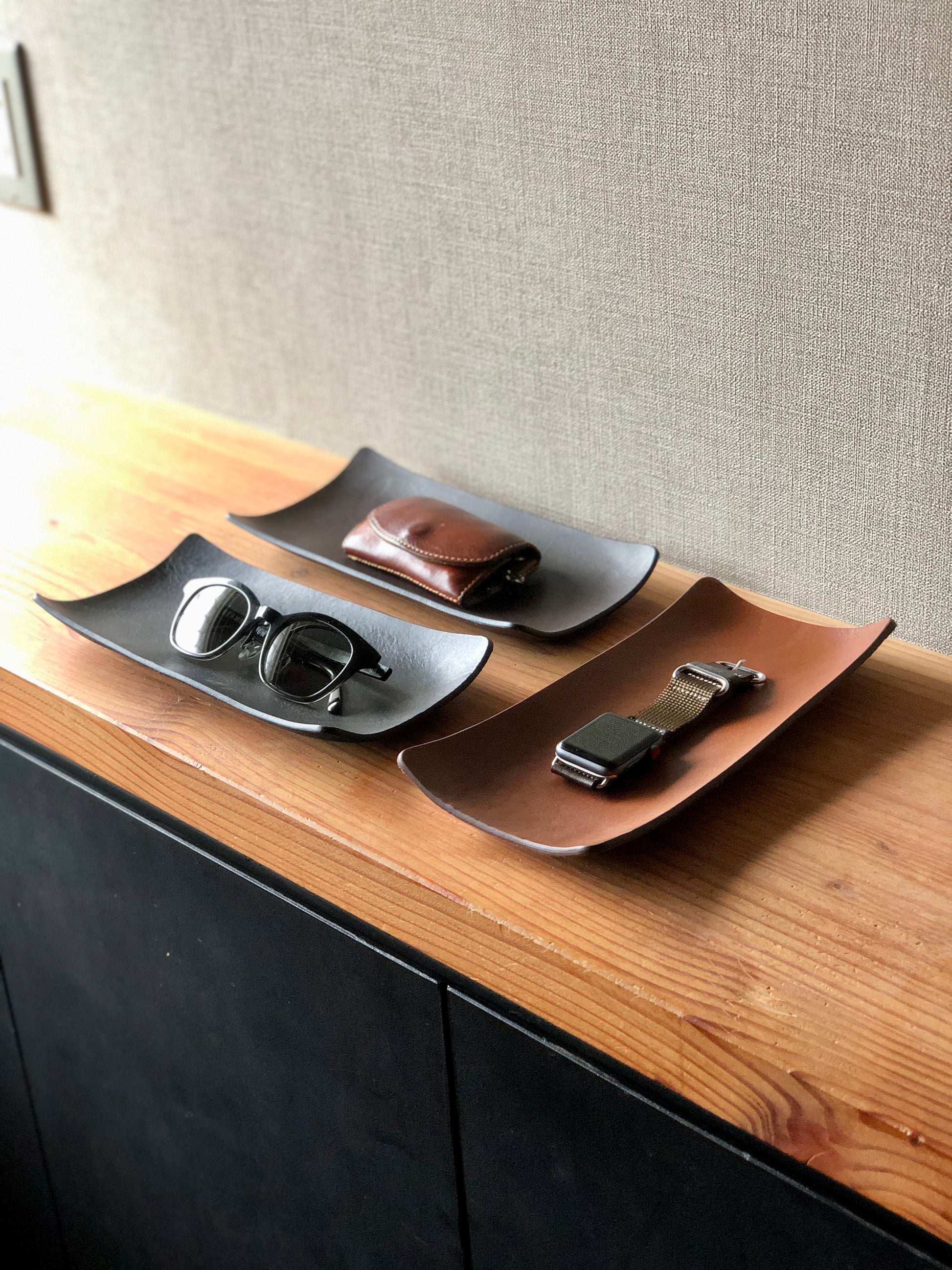 家に帰ってきた時に、腕時計やアクセサリーを置くアクセサリートレイとしてご使用いただけます。レザーの柔らかいクッション性で、大事なアクセサリーや時計をキズつける心配もありません。あなたの大切なお気に入りのアクセサリーを置いてください。