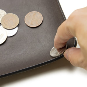 端はなめらかなカーブなので小銭が取りやすくなっています。小さい指輪なども。 引っかかる『角』がないのでどの角度からでも小銭がつまみやすく小銭が多い時はスライドさせてもOK。実は使い勝手もすごくいいんです。