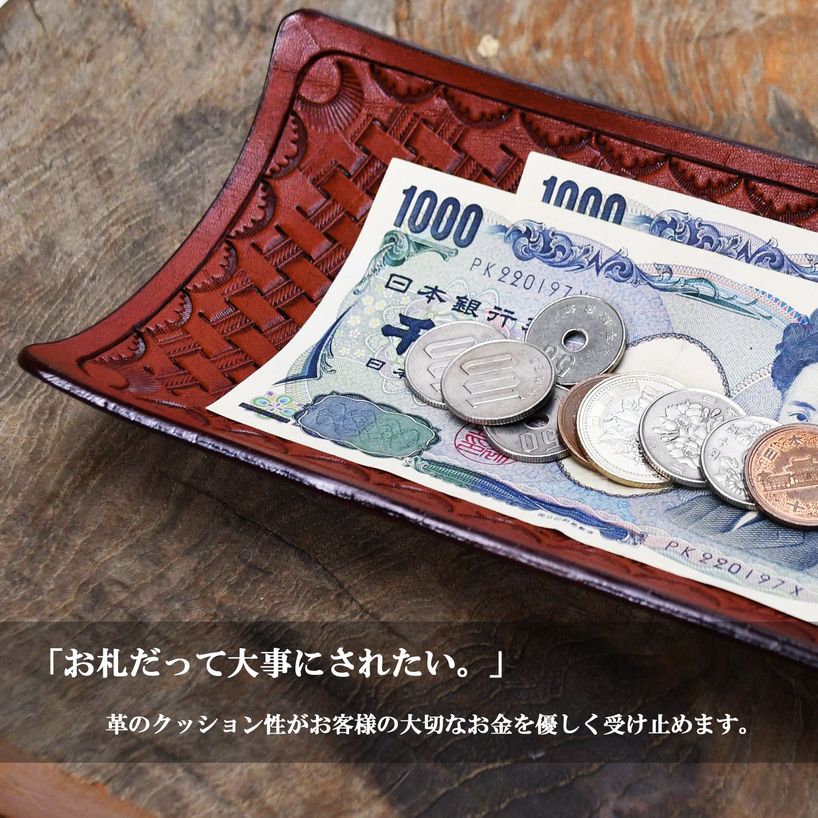 お店のキャッシュトレイとしてもご利用いただけます。 お客様の大事なカードやお札を、金属のトレーでなく、温かみのある優しい革で受け止めることができます。